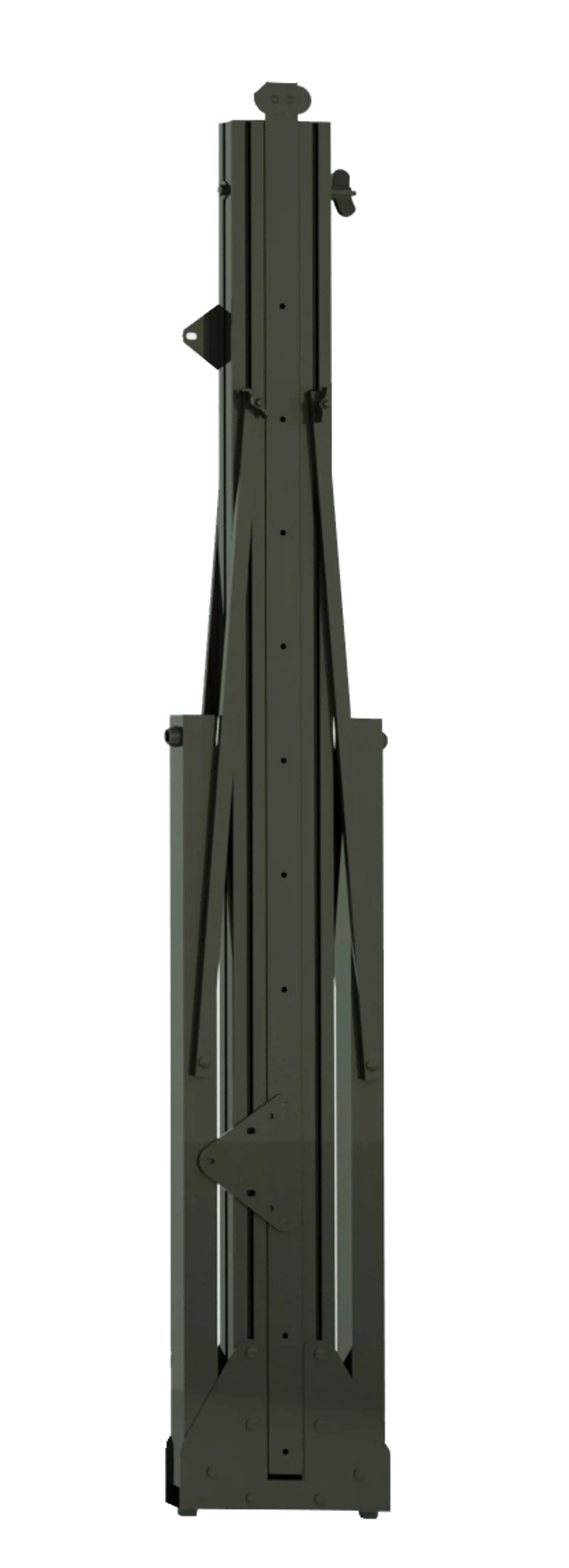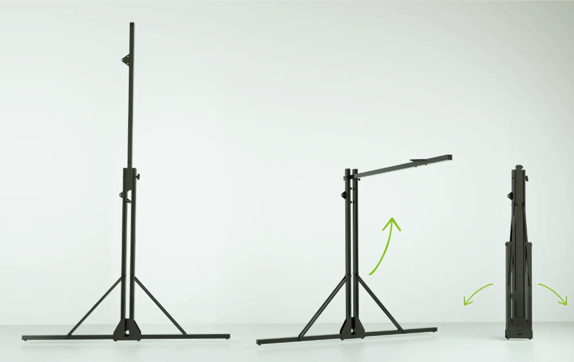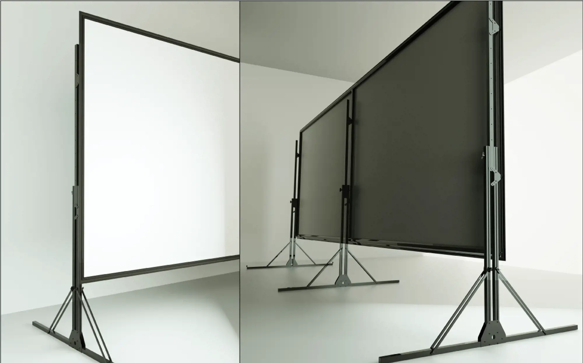 Designed for positioning the screen on the floor, they are made of matt, anti-reflex, high-resistance aluminium with black finish (3 cm section). The extension is obtained by rotating the upper profile which features some holes to anchor the screen at different levels. The floor anchoring is possible thanks to the horizontal segments which can be lowered separately and blocked by special reinforcement 45° joints.The product comes with PVC locking screws with black butterfly knobs. Once it is closed, it is light and compact for easy transportation.