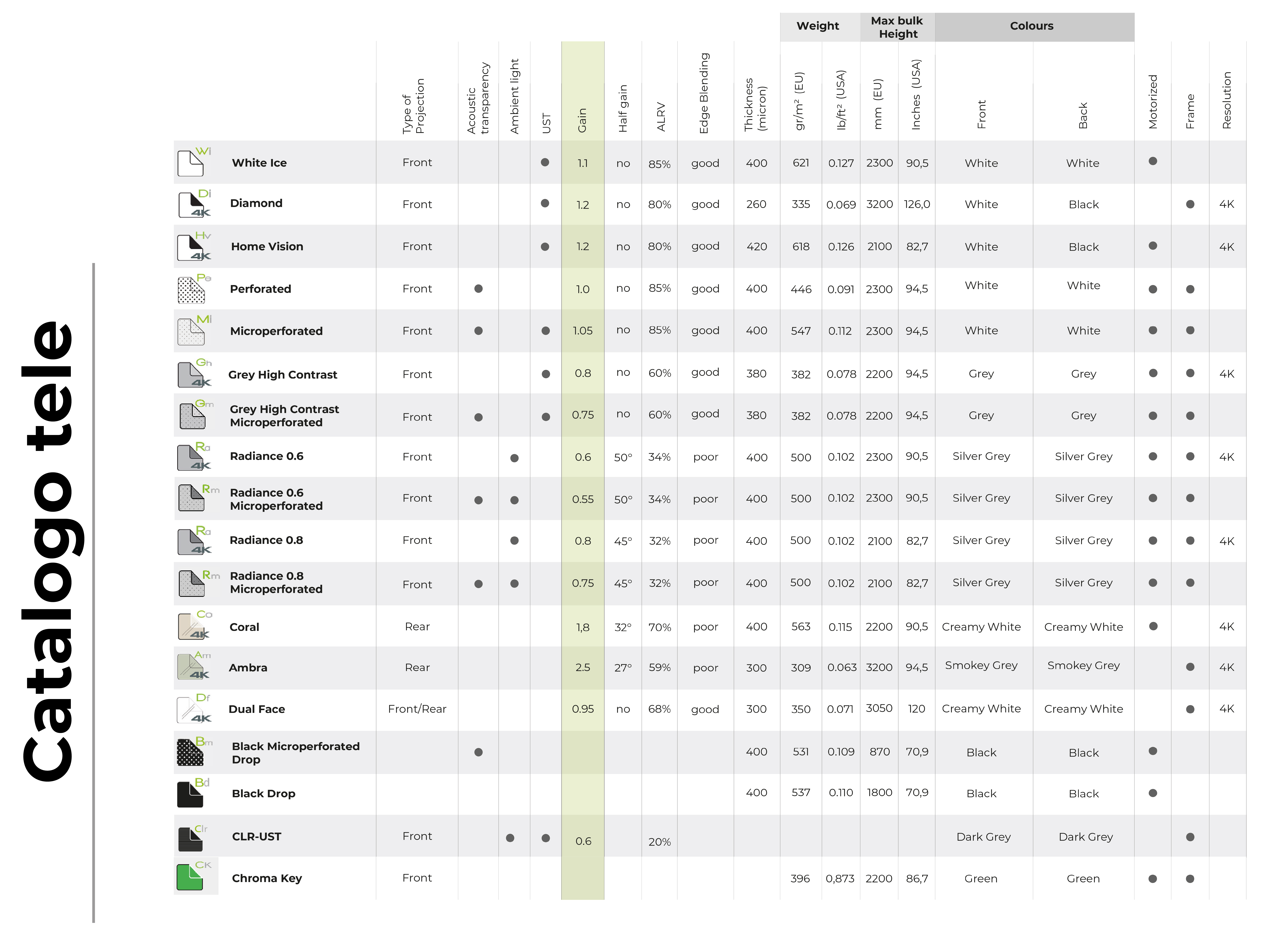 Ogni tipo di tela (bianca, grigia, retroproiezione, UST, microforata, ecc.) gestisce in modo diverso la luce, migliorando il contrasto e la definizione in base all’ambiente e al tipo di proiettore. -