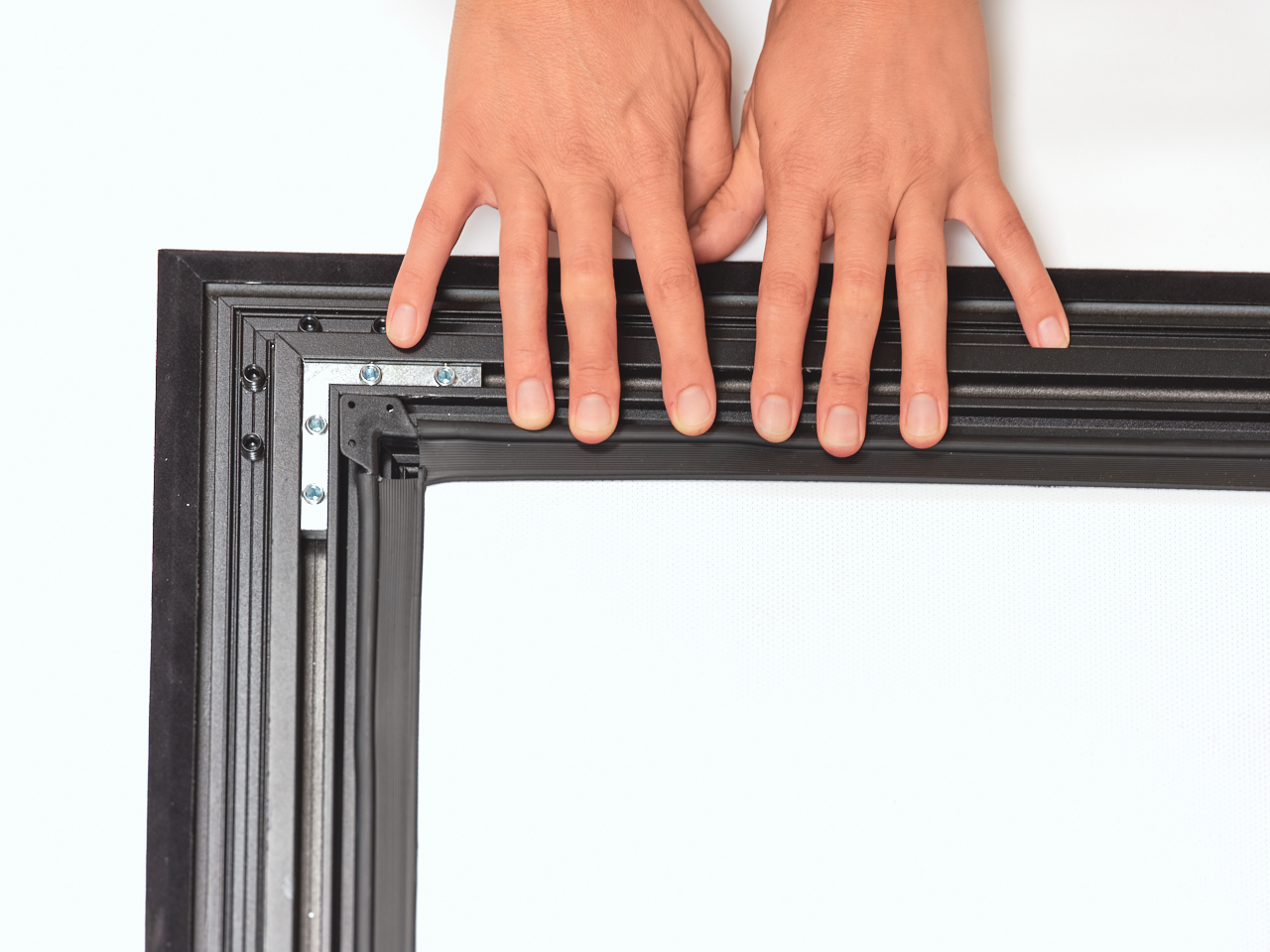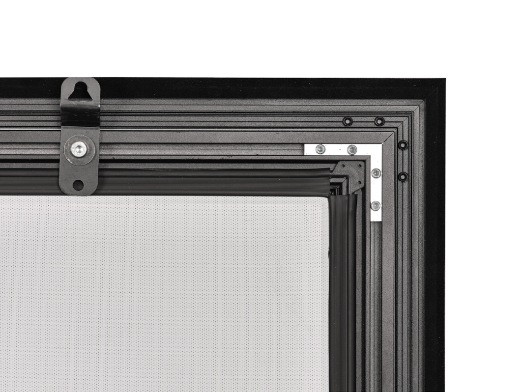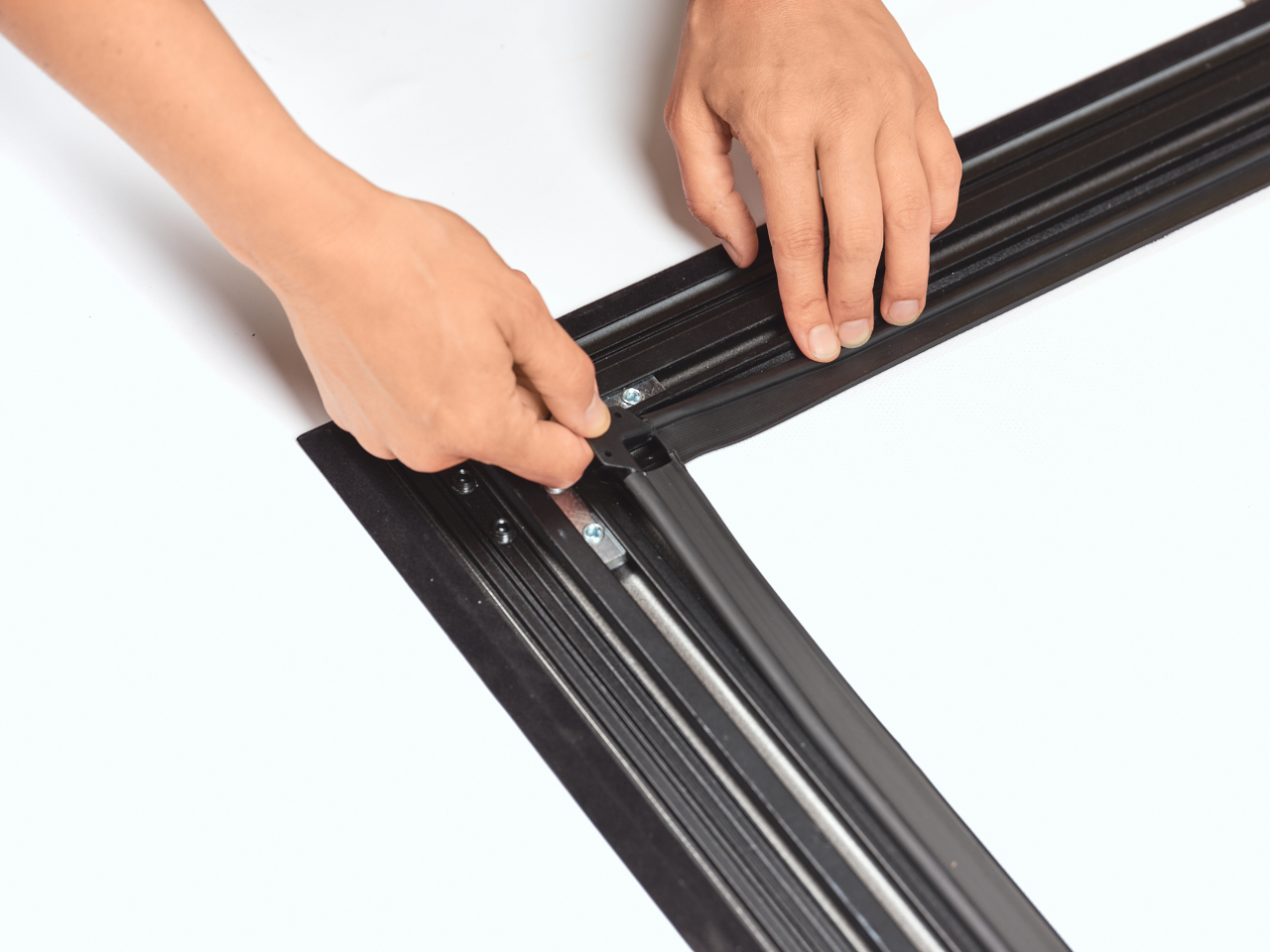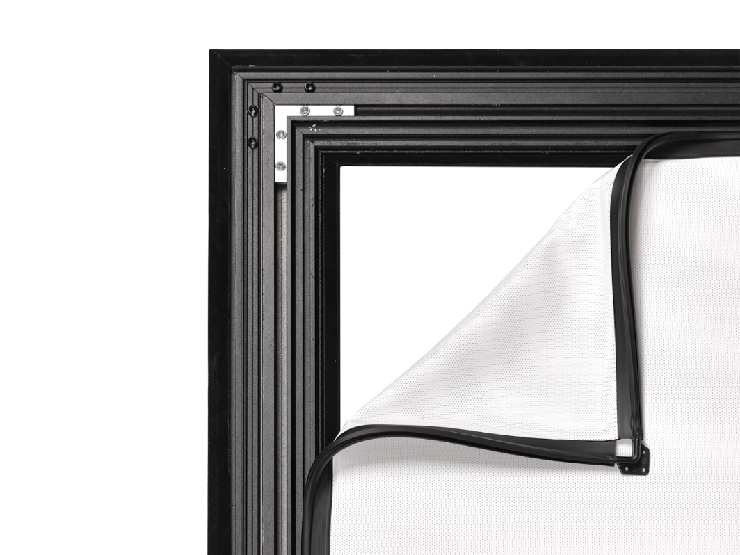 Il profilo interno, inclinato a 45°, è progettato per riflettere correttamente la luce dei proiettori UST, assicurando una visione nitida e uniforme. La tensione perfetta del telo, installato sul retro della cornice, garantisce una superficie di proiezione perfettamente planare, priva di ondulazioni.