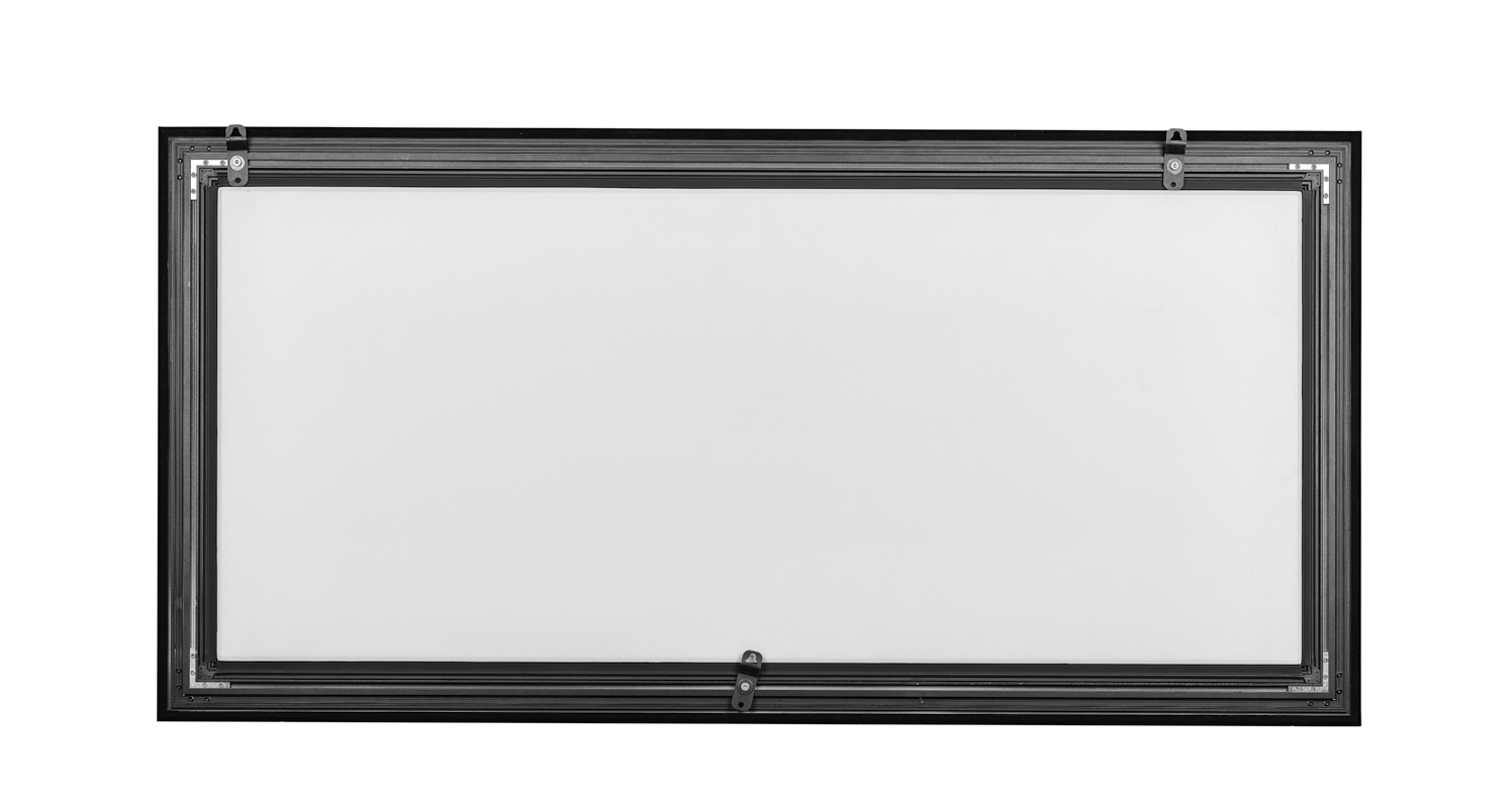 Disponibile in formati da 200cm a 600 cm di base, è dotato di un telaio in alluminio di 10 cm finemente rivestito in velluto nero, appositamente studiato per assorbire la luce parassita e massimizzare il contrasto dell'immagine.
