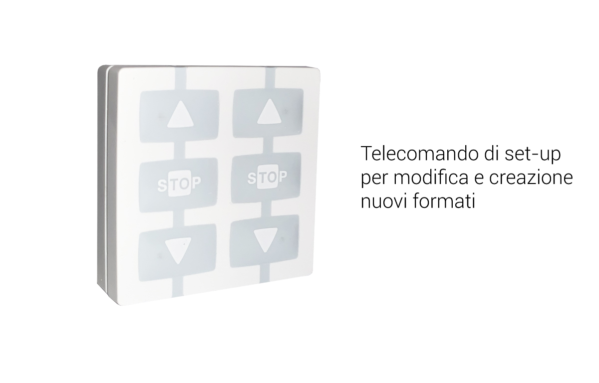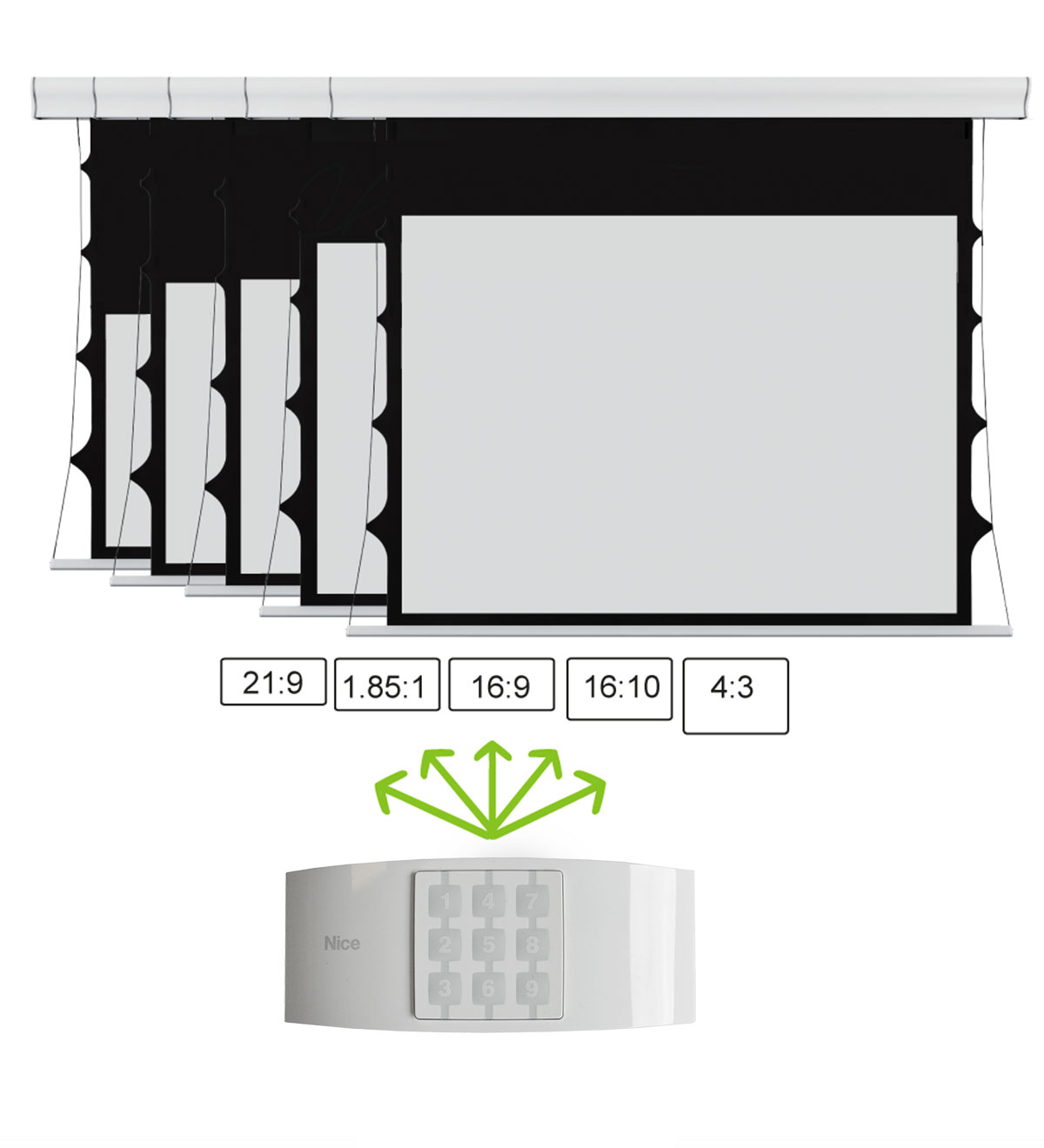 Grazie ai nuovi motori con encoder incorporato e centralina integrata dedicata, le due tele, una nera e una di proiezione, giocano fra di loro per creare sino a 9 combinazioni di formato.