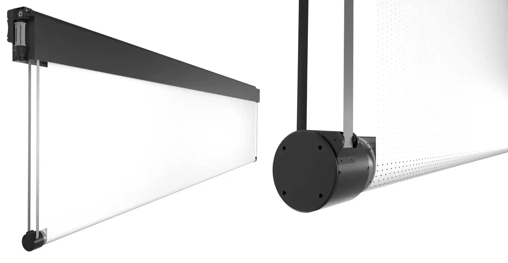 Questo innovativo sistema elimina ogni rischio di accavallamento o slittamento, assicurando una discesa stabile, precisa e silenziosa anche su grandi superfici di proiezione.