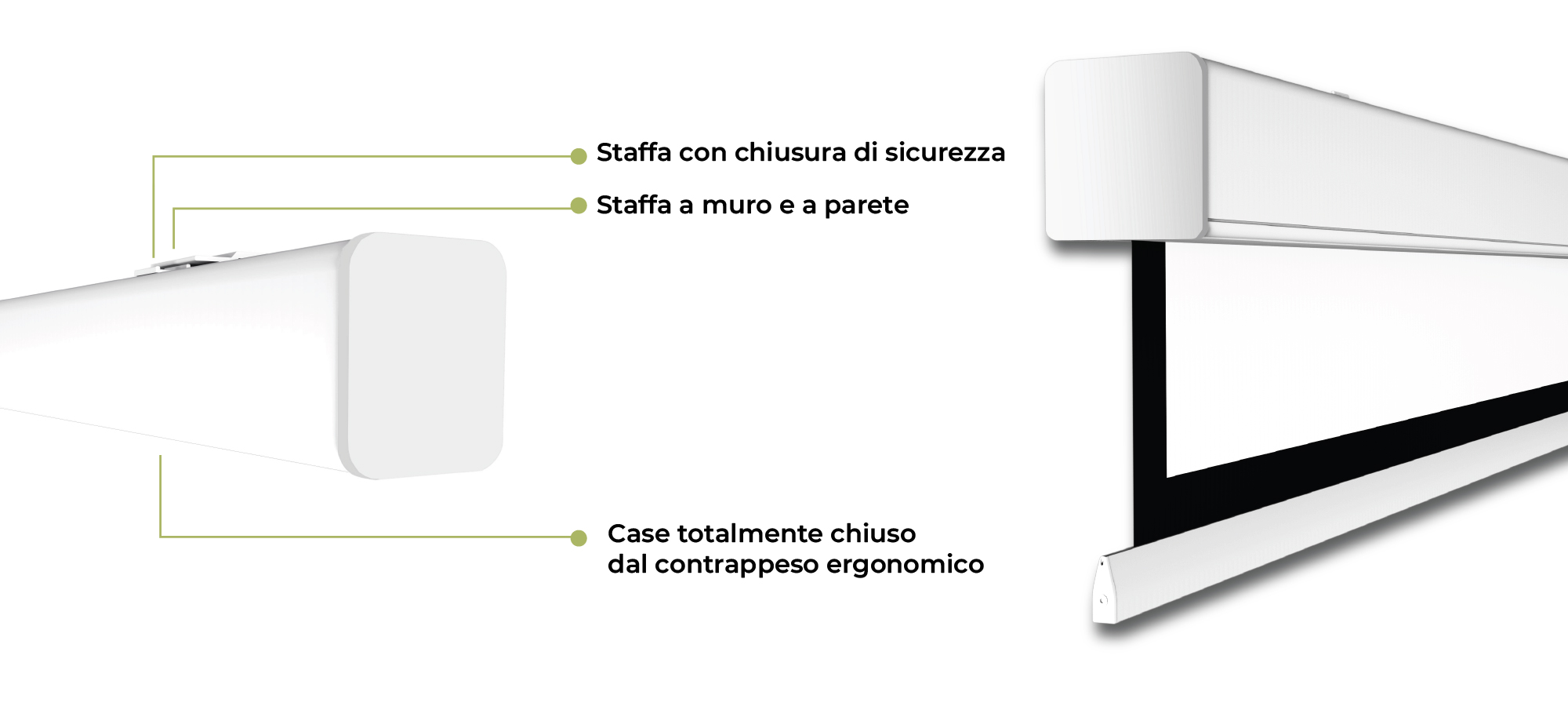Schermo motorizzato perfetto per contesti business di medie e grandi dimensioni, come sale riunioni, uffici e hall. Il suo case bianco opaco, dal design essenziale, si integra armoniosamente in qualsiasi ambiente, offrendo una soluzione discreta e raffinata.