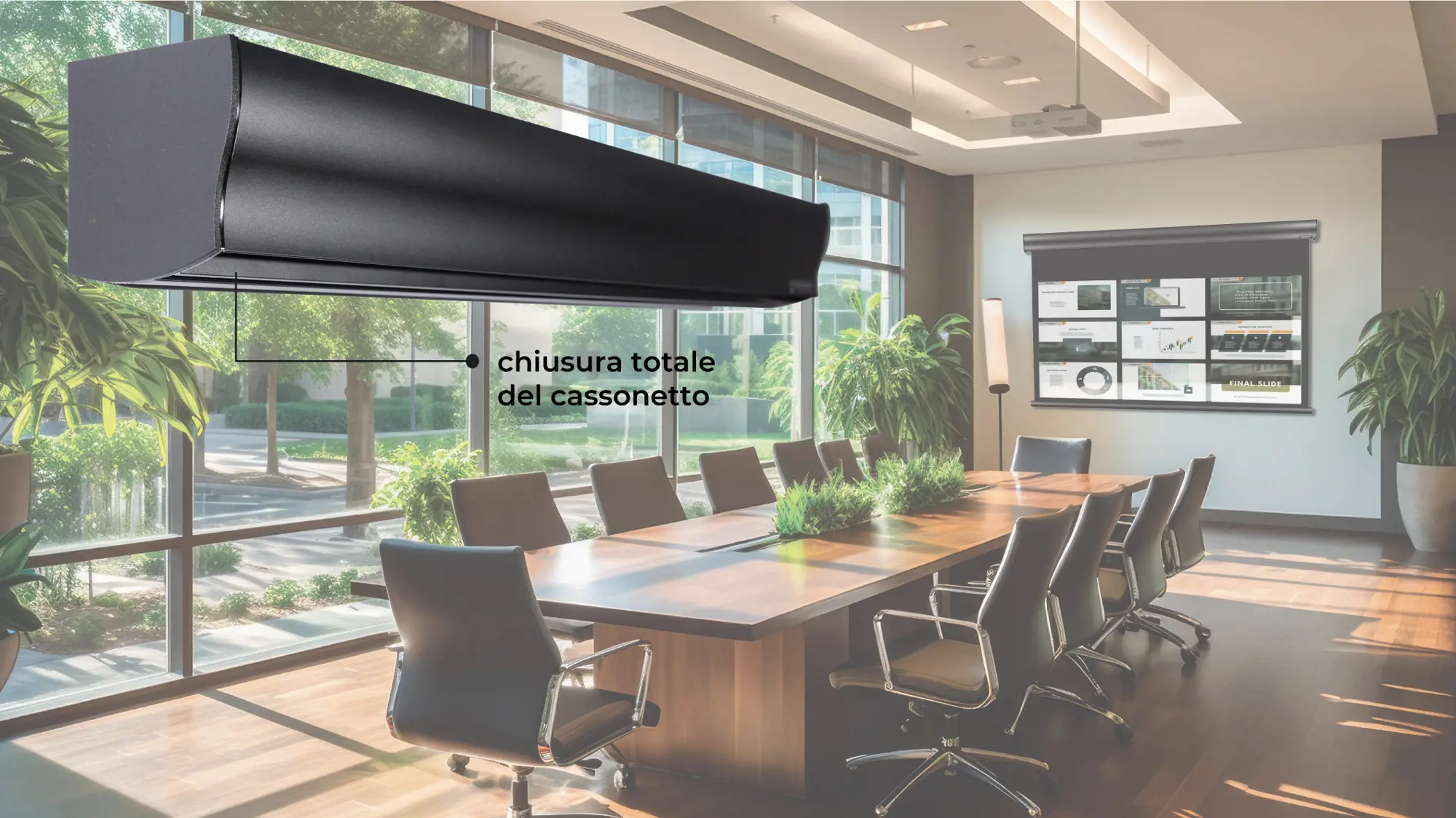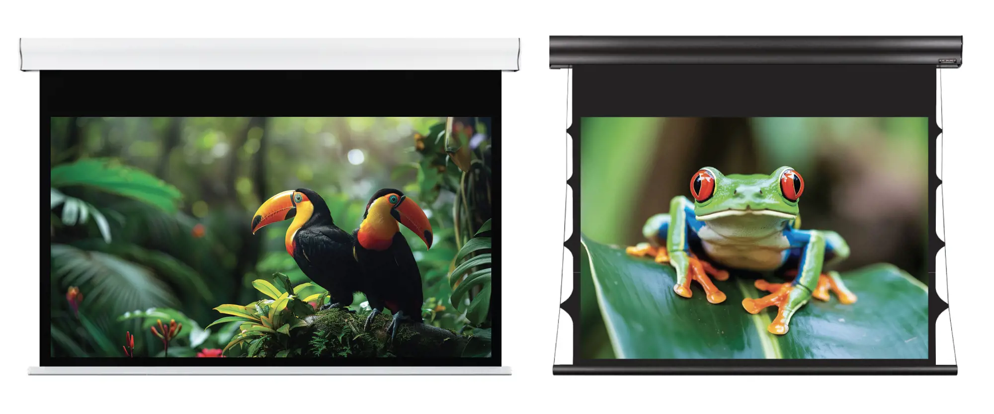 La discesa anteriore del telo, a circa 11 cm dalla parete, garantisce una perfetta planarità e lascia spazio per inserire elementi decorativi o tecnologici – come TV, quadri o pannelli – senza comprometterne l’estetica o la funzionalità.