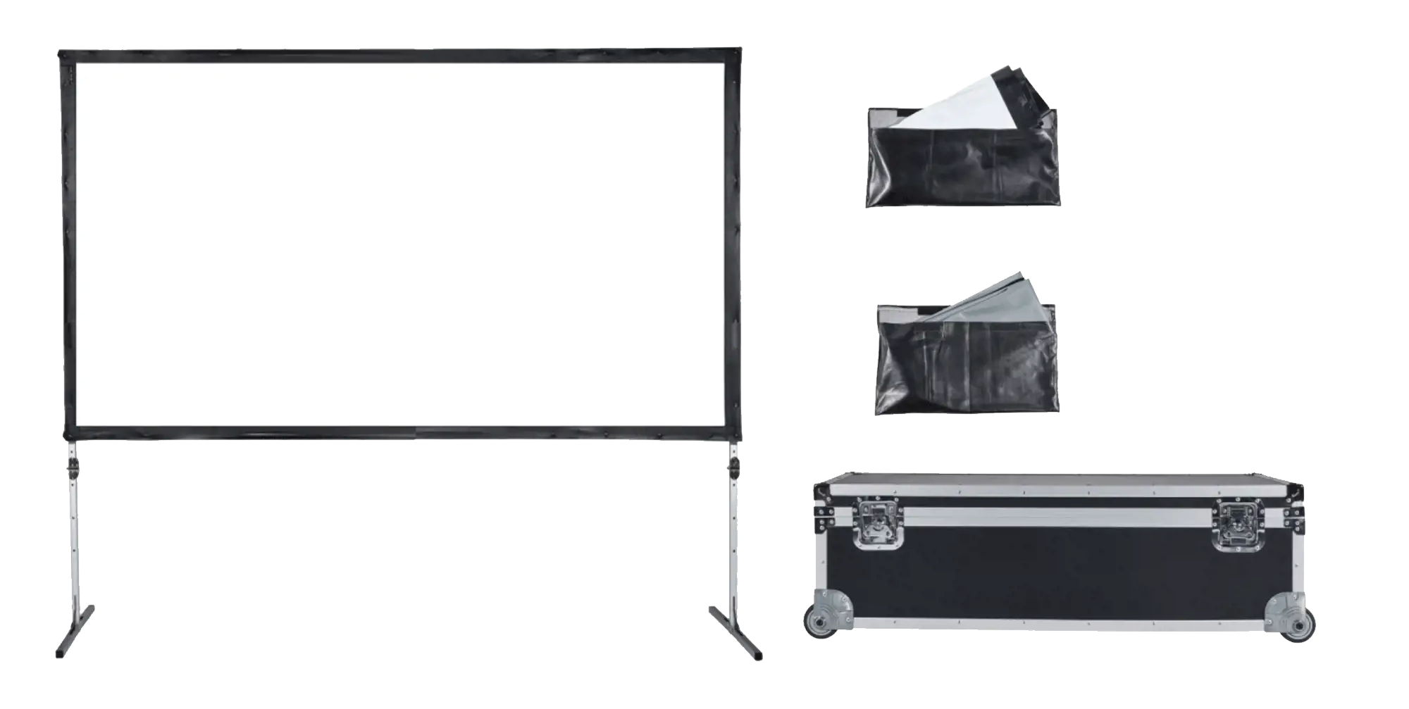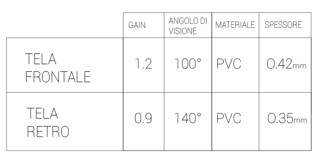 Composto da cornice, stativi, una tela frontale e su richiesta una tela retroproiettabile.