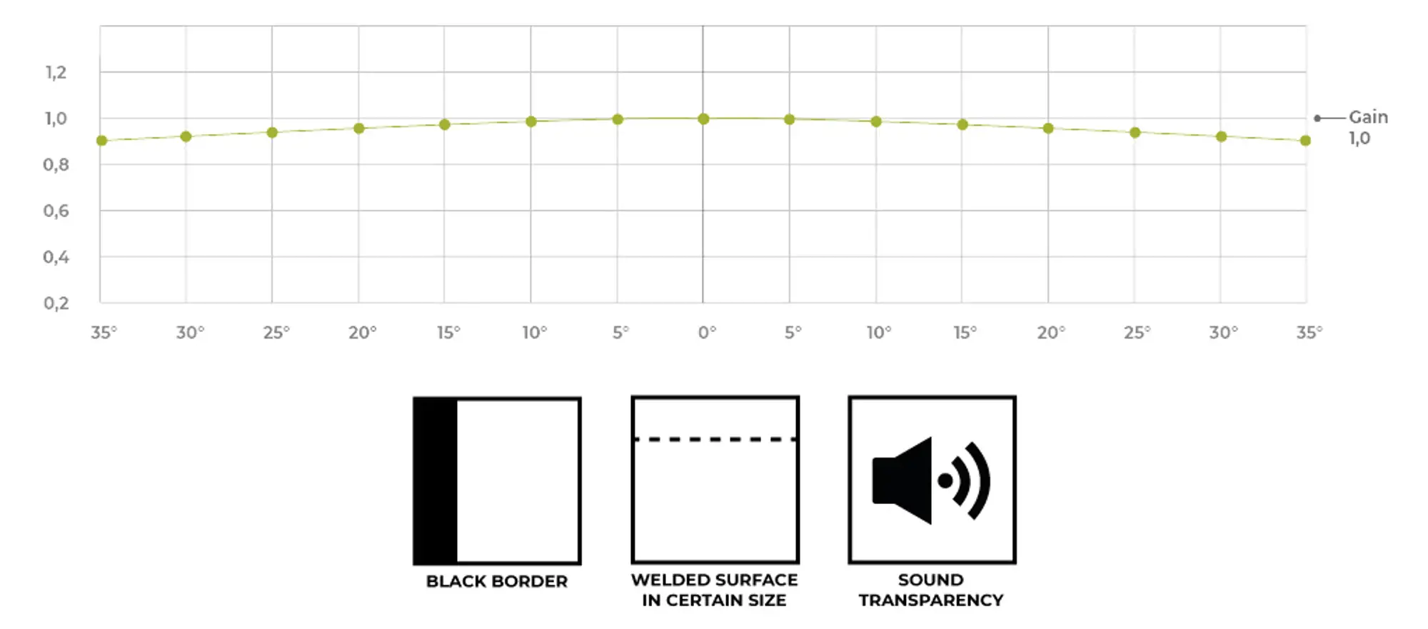 Superficie per proiezione frontale trasparente al suono, ideale per essere utilizzata in schermi di dimensione importante e in ogni caso con base superiore ai 300 cm. Realizzata in PVC, è saldabile e può essere utilizzata sia su schermi motorizzati sia su schermi a cornice, in situazioni in cui le casse acustiche vengano posizionate sul retro dello schermo. La perforatura risulta perfettamente invisibile durante la proiezione.