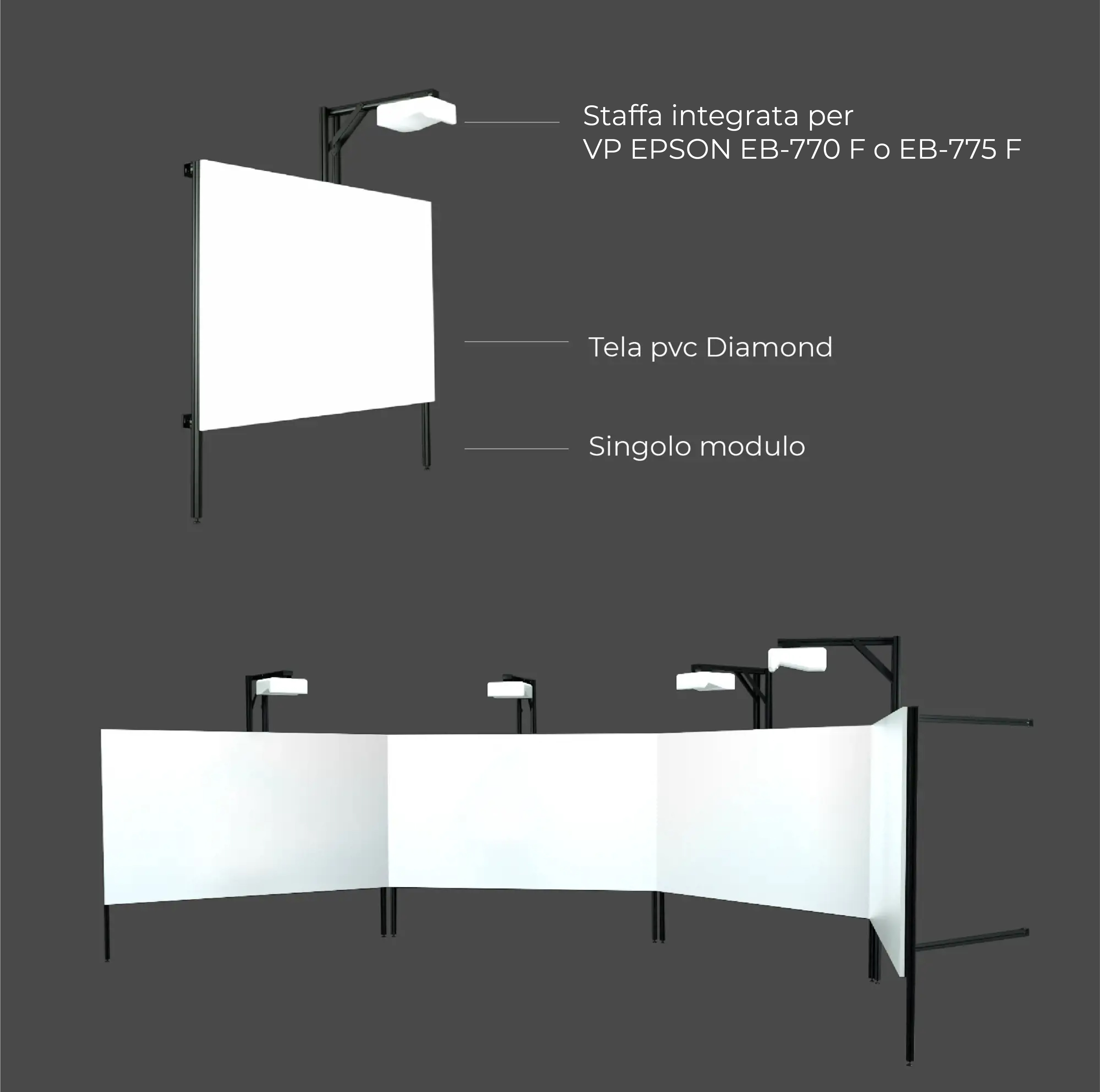 Lo schermo si compone di moduli identici costituiti da telaio in alluminio e schermo per la videoproiezione con tela Diamond. Il singolo modulo è poi accessoriato con staffe a parete, braccio a parete o stativo in base alla collocazione spaziale di installazione.
