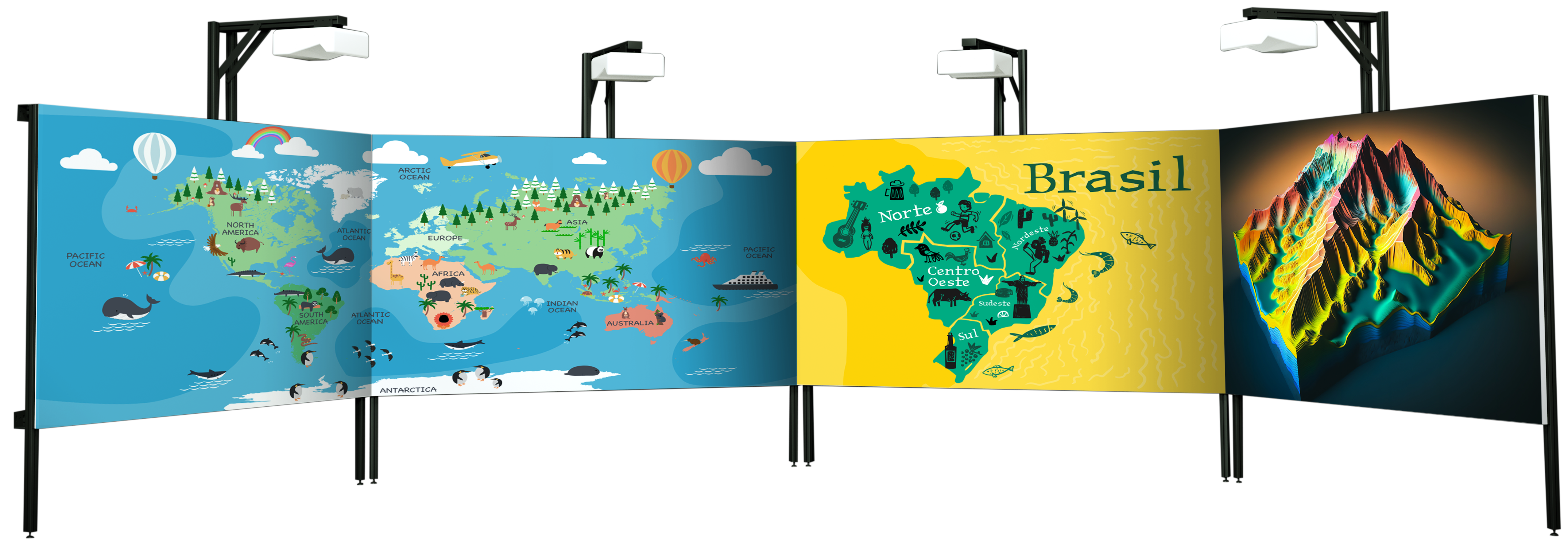 Ideale nelle scuole per mostre e percorsi narrativi, lo Schermo Immersivo Modulare è progettato per offrire la massima libertà di configurazione.