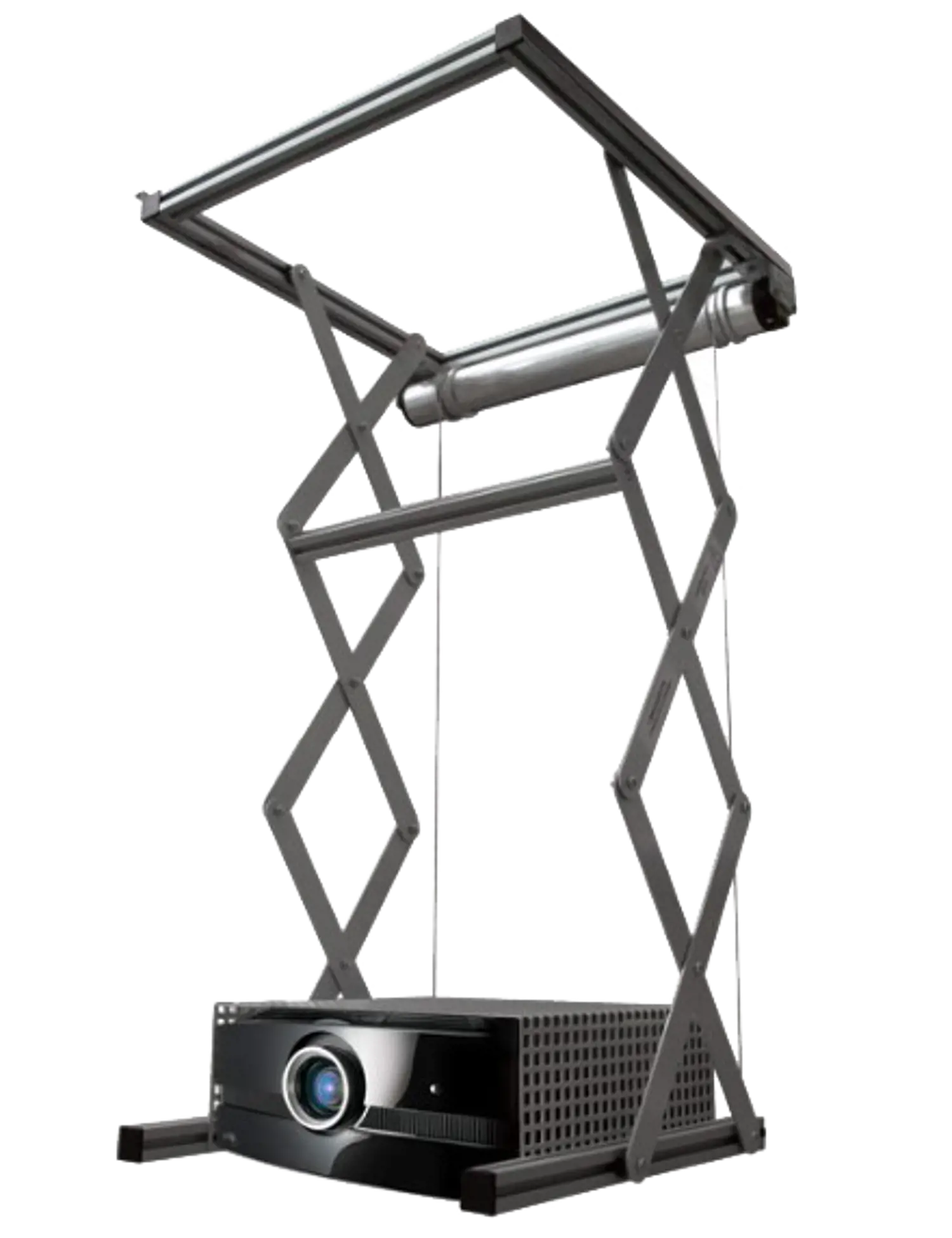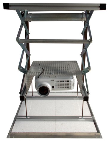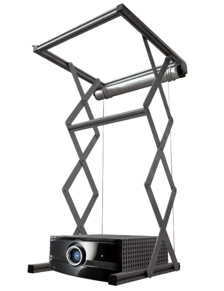 La staffa motorizzata “ProjectorLift” è adatta per fissare a soffitto qualsiasi tipo di proiettore. Si può inoltre prevederne la completa scomparsa nel controsoffitto, in quanto si può applicare sul fondo il pannello rimosso per l'installazione. Grazie al suo sistema di fissaggio è possibile effettuare una regolazione ottimale anche in presenza di soffitto non perfettamente a livello. La staffa viene fornita completa di interruttore a tre posizioni per la salita, la discesa e lo stop. A richiesta è possibile dotare la staffa “Vario Lift” di telecomando o di motore con ricevente radio integrato. La piastra a cui va fissato il proiettore è completamente forata, per facilitare così l'installazione di vari tipi di proiettori. E' possibile regolare i finecorsa sia in salita che in discesa, per adattare la staffa alle più svariate esigenze. La versione “Vario Lift HC” è caratterizzata da un cestello porta proiettore di dimensioni maggiorate,per poter ospitare apparecchi per Home Cinema anche molto voluminosi.