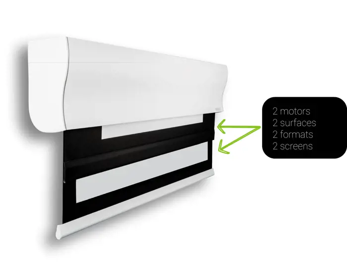 Progettato per chi cerca il massimo della versatilità, Wave Biformat racchiude due schermi in un unico cassonetto. Grazie alla presenza di due motori verticali indipendenti, ogni telo può essere azionato separatamente, offrendo soluzioni flessibili per ogni esigenza d’uso.